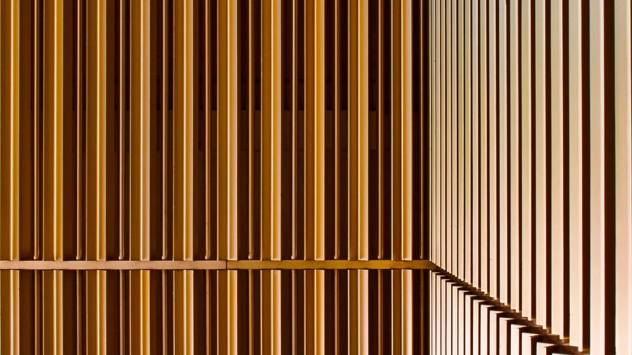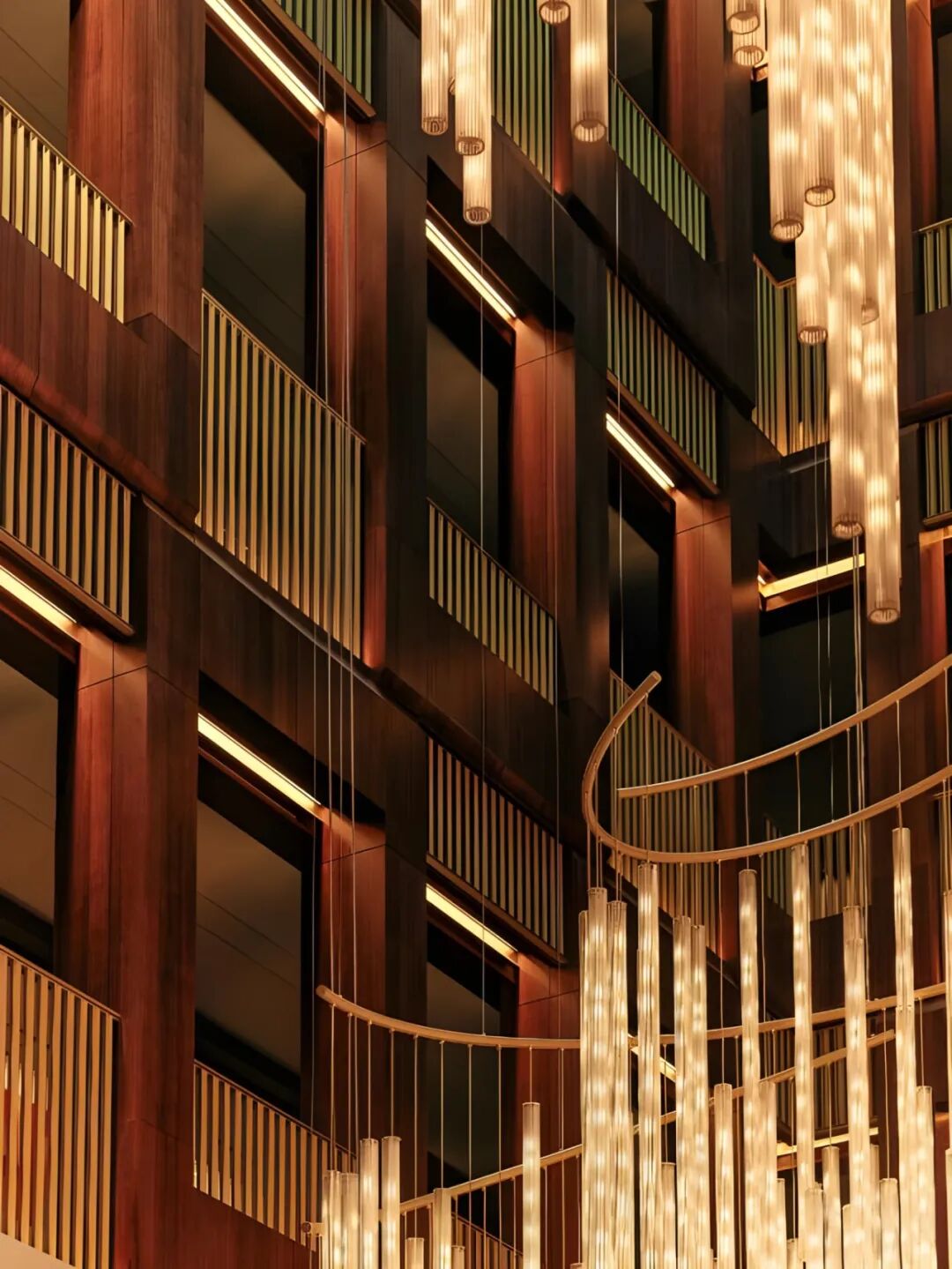 中性色調與細膩光影層次營造寧靜氛圍,金色格柵反射的光暈在茶室中形成“豎琴般的詩意”。