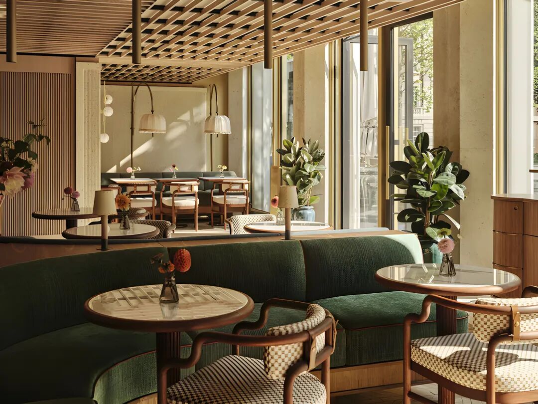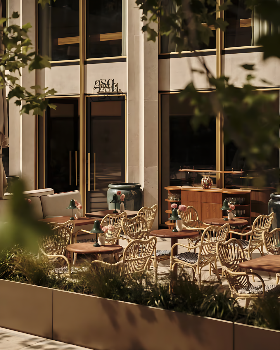 由AvroKO設計的地中南海岸風情空間,編織屏風與大型植物營造親密氛圍,俯瞰格羅夫納廣場。
