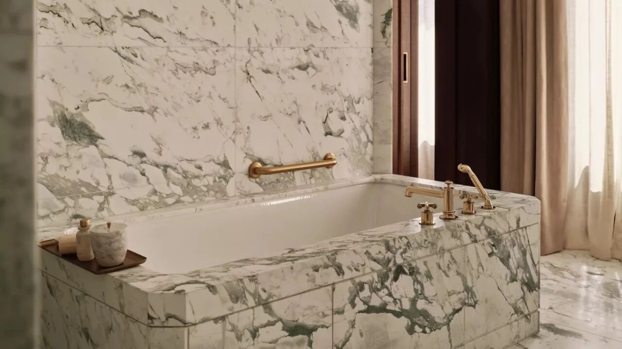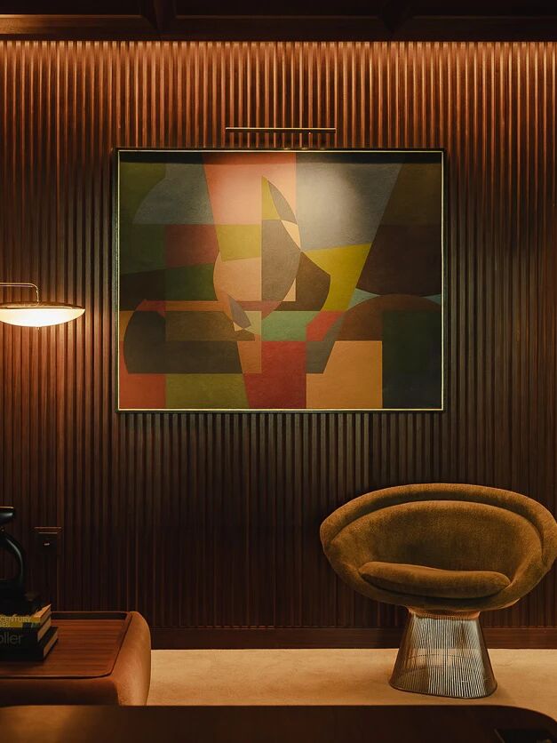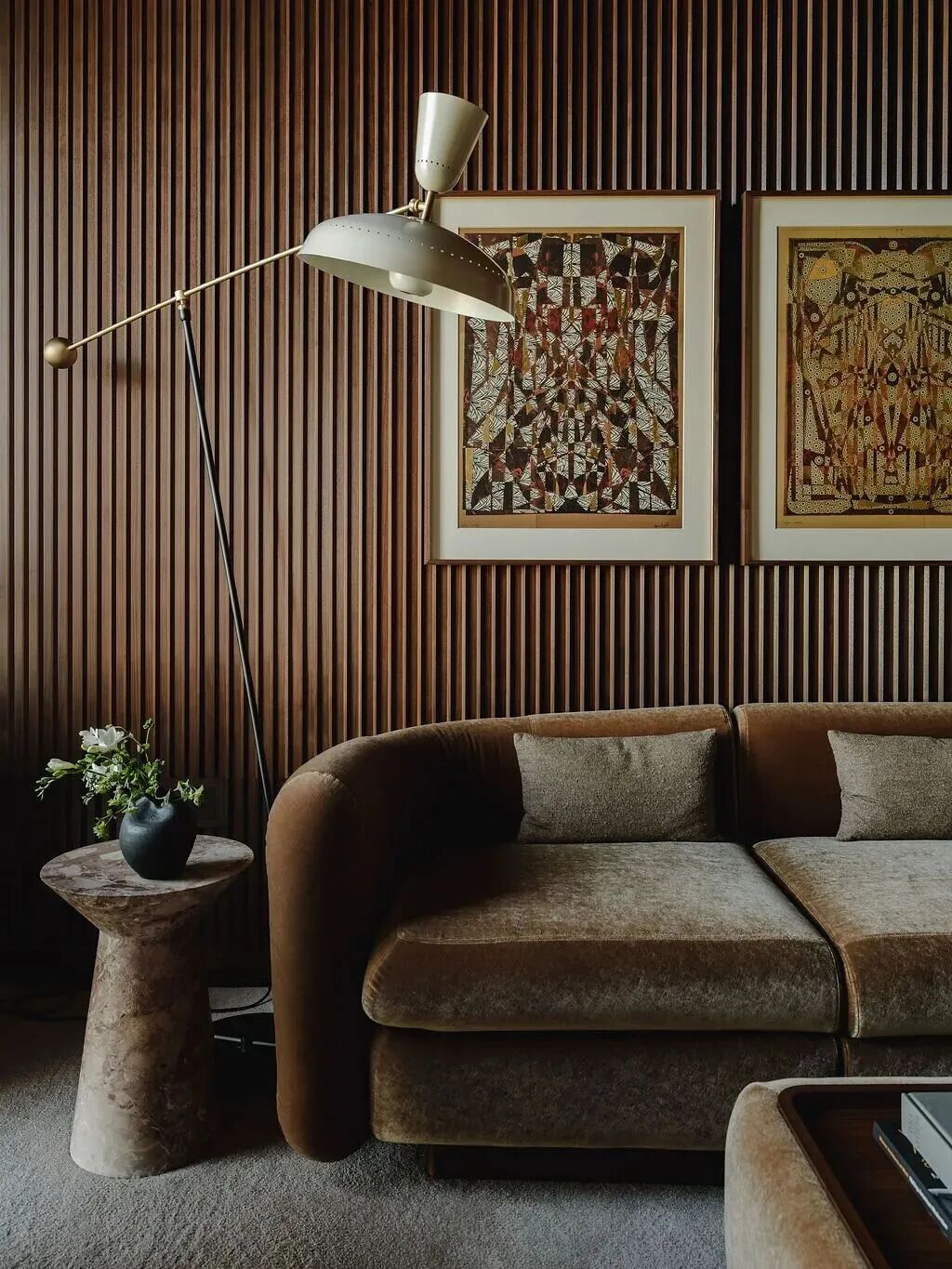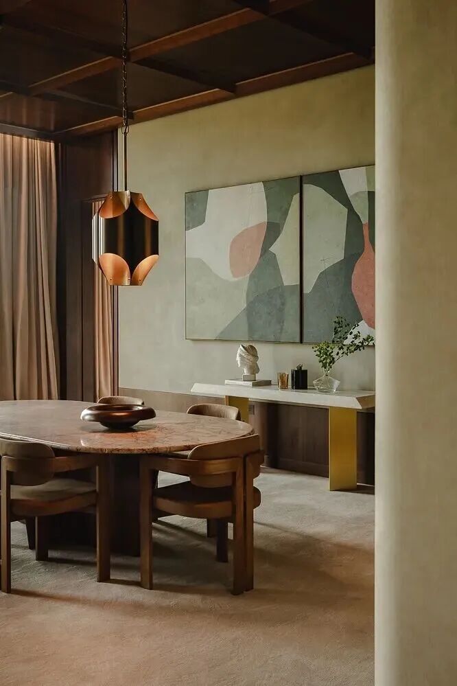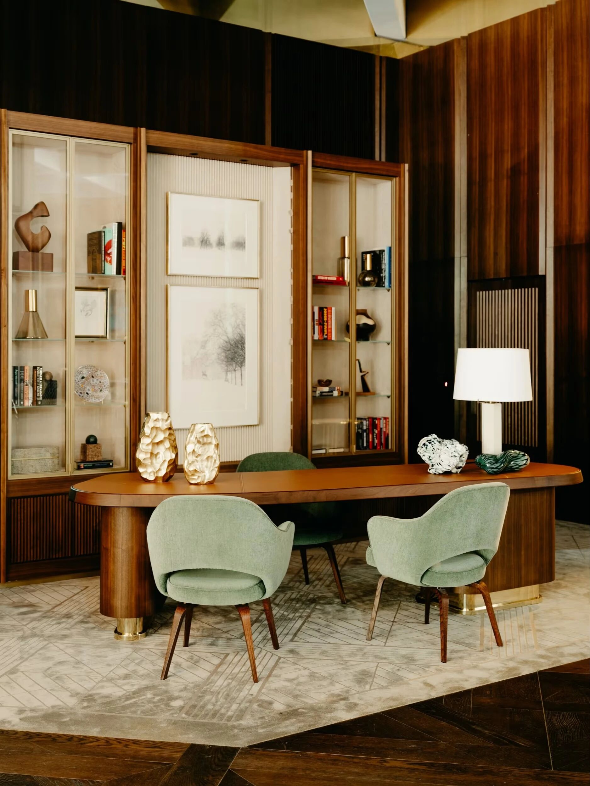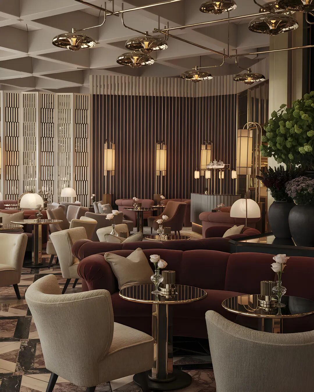 天然石材、木材與織物的溫潤觸感取代浮華裝飾,絲絨沙發、皮革與羊絨織物構成低調紳士化的空間語言。