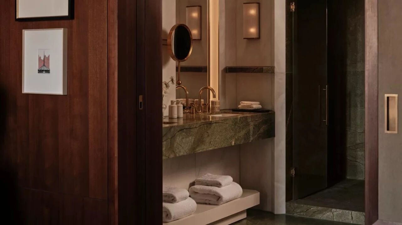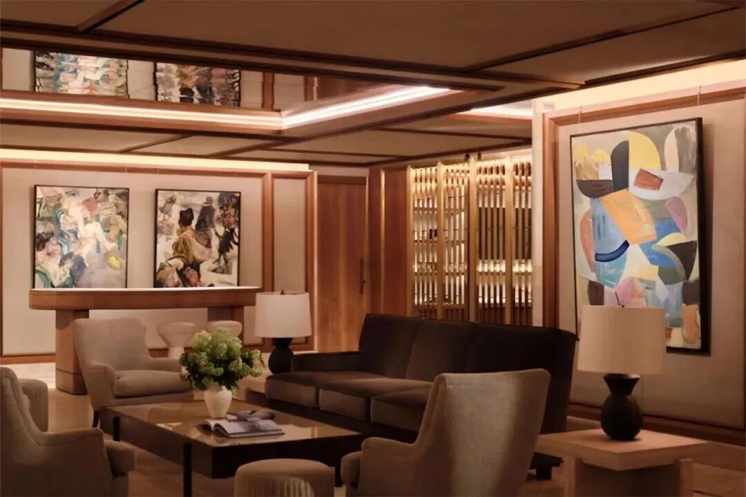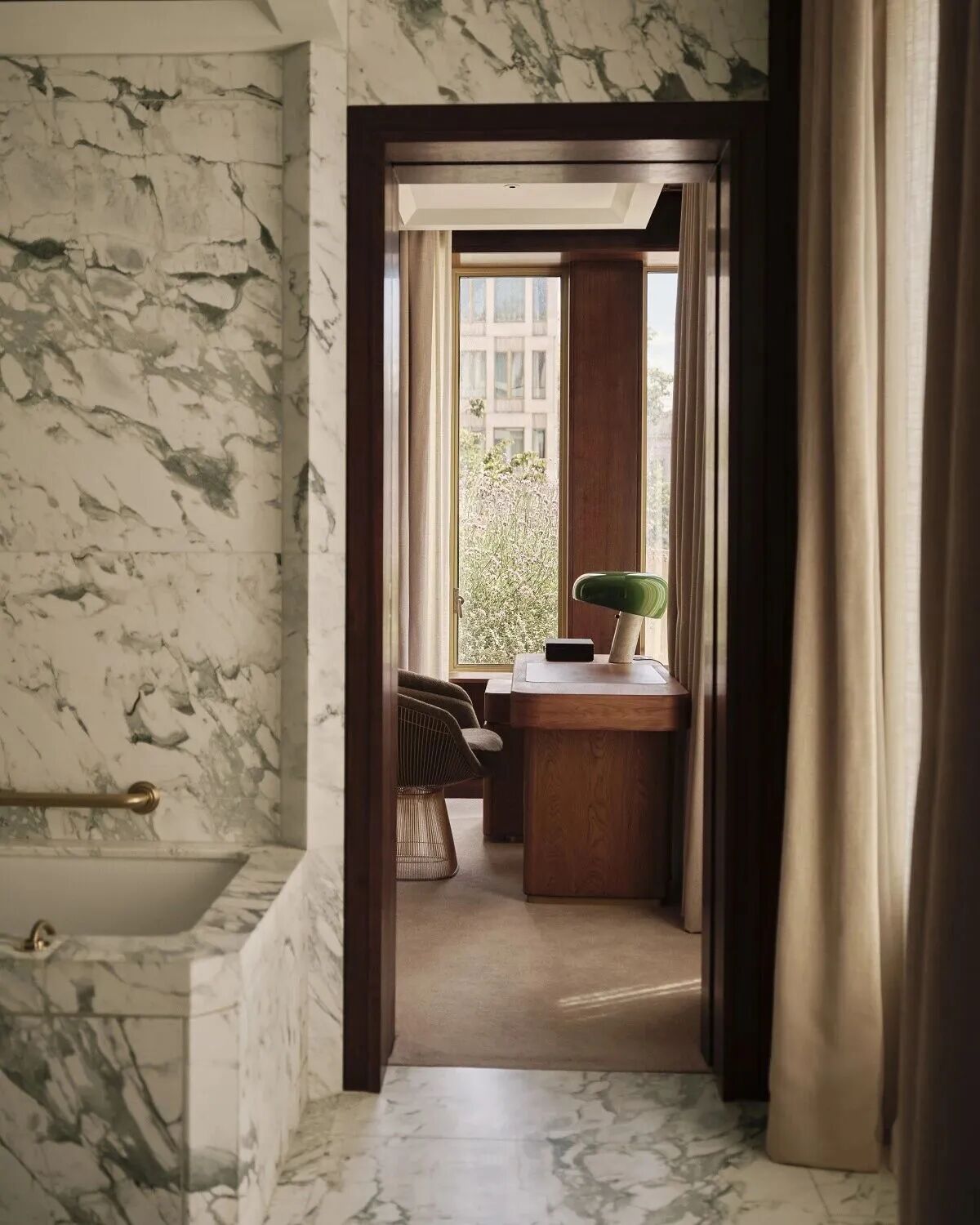 酒店規劃150+間客房與套房,以“私人府邸”為藍本。全為套房配置,面積普遍在60平方米以上。每一間都設有獨立起居空間、步入式衣帽間、專屬書房與大理石衛浴。
