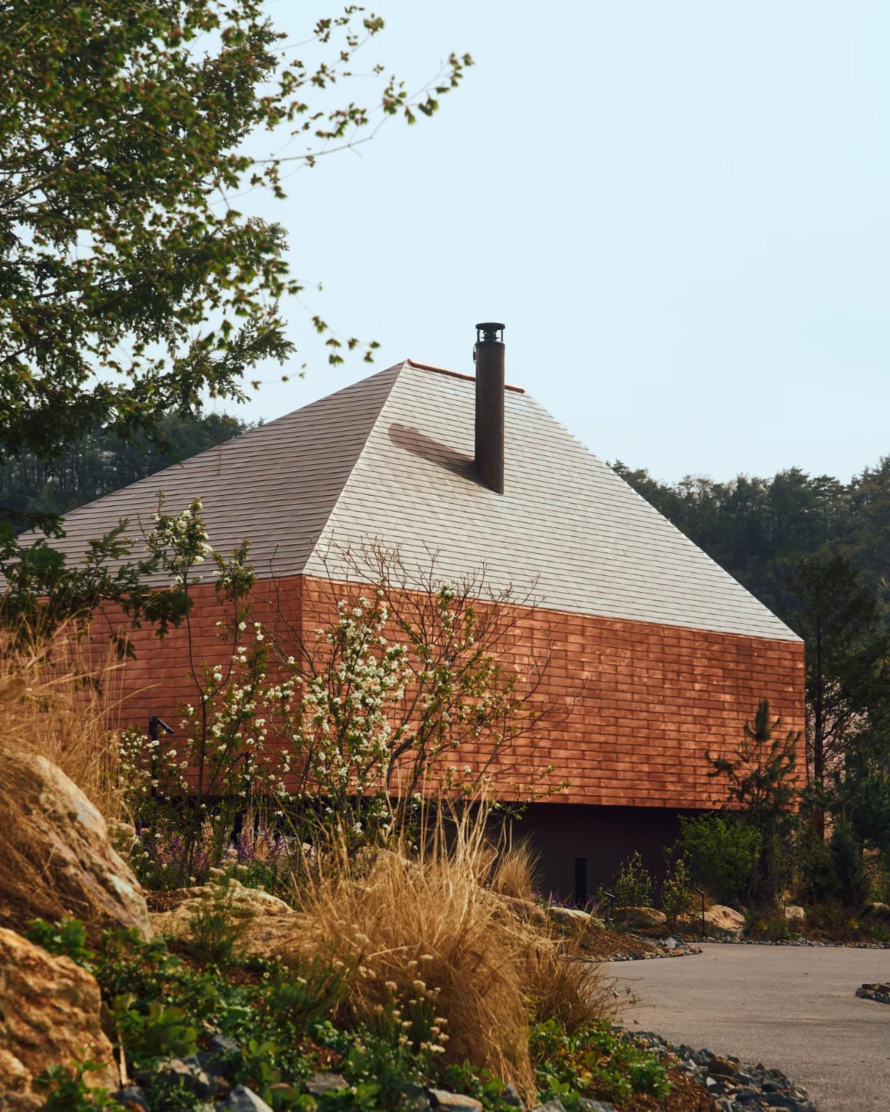 建筑的外立面銅板猶如時間的畫布般,初為玫瑰金,漸染青綠,終與苔蘚巖石融為一體。