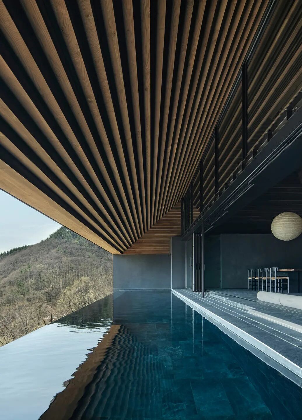5米無邊際泳池如凝固瀑布,與河谷水平線呼應(yīng),游弋仿若云端滑行。池底做舊石材映照天光,水成天空與建筑的液態(tài)紐帶。