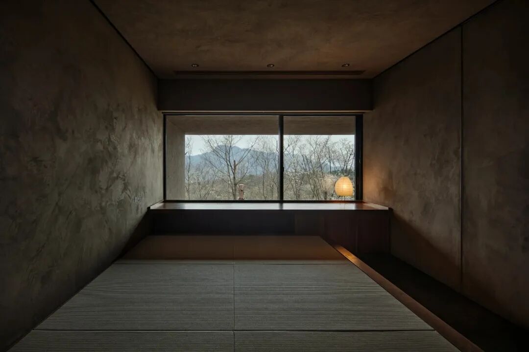 矩形大窗框住林間光影,榻榻米與灰泥墻面交織侘寂氛圍。