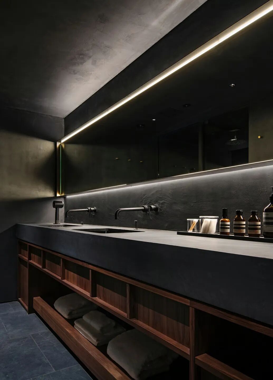 浴室深木色與灰泥營造沉靜,一體化臺面和線性照明延伸視覺。